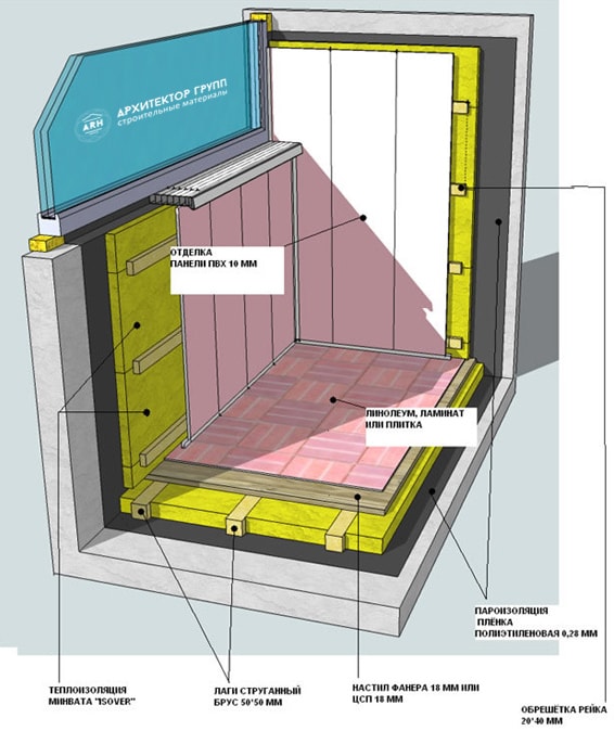 Потолок балкона утепляется по аналогии со стенами легким пенопластом.